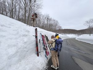 早速、赤倉岳(1,548m)を目指してシ—ル登行、ロープウェイ山頂駅から約200m標高を上げながら、赤倉岳の大斜面へ。山頂手前から滑走スタート!自分の好きな回転弧でシュプ—ルを描く。南側にトラバ—スすると八甲田温泉コ—ス、みちのく温泉へ誘うブナ林を眼下に広大なスロ—プがさらに一枚、大斜面を満喫。赤倉岳の東側の断崖と大岳を眺めながら、皆さん大きなタ—ンで気持ちよさそうに滑走!あとは春のブナ林をツリーラン。国道40号線に出ると専用車が待機、再びロープウェイ駅から運良くもう一本乗車。