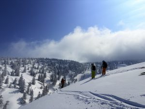 強風にてロープウェイ運休が早々に決定してしまいました。八甲田スキースクールの専用車で酸ヶ湯温泉へ。青空のもとブナ林の大岳環状ルートをゆっくりと南八甲田の櫛ケ峰、横岳を眺めながら、時より強烈な西風にフォローされながら登りとなりました。青森トドマツの植生地帯を越えると約2時間少しで仙人岱ヒュッテ(1320m)へ到着。大岳、小岳、高田大岳、そして南八甲田の乗鞍岳が全て姿を見せてくれました!