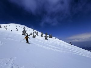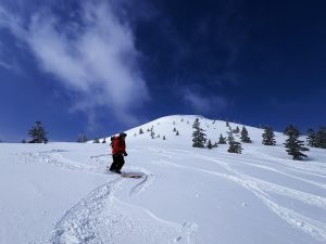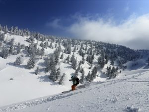 標高差も大きくとれて滑りごたえのあるルートです。広いバーンにはパウダーが残っており、気持ちよく滑走できました!